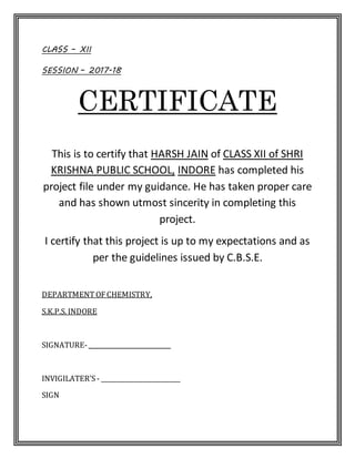 This chemistry project examines the contents and adverse effects of soft drinks. Through a series of tests, the student found that four popular soft drinks brands (Coca Cola, Sprite, Limca, Fanta) contain glucose, alcohol, sucrose, phosphate, and carbon dioxide. Coca Cola had the lowest pH (most acidic). While sugars provide energy, high intake through soft drinks can lead to health issues like diabetes and weight gain. Phosphoric acid damages tooth enamel and the acidic environment harms digestive organs. However, trace alcohol levels do not affect health. The project concludes that while soft drinks taste good, their acidic contents and high sugars have negative health consequences.