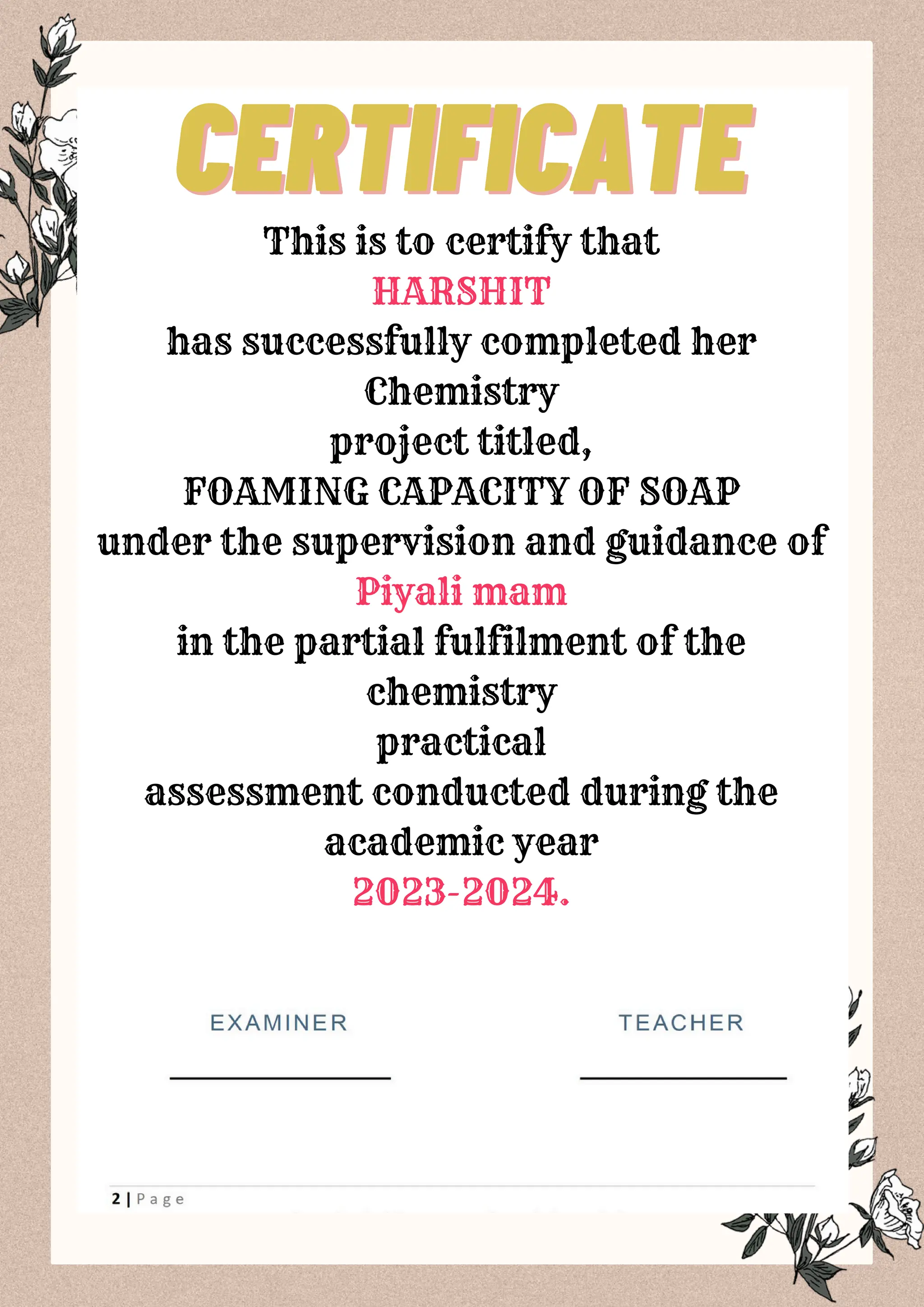 The document certifies Harshit for successfully completing a chemistry project on the foaming capacity of soap under the guidance of Piyali Mam during the academic year 2023-2024. The project explores how soap works, highlights various soap-making methods, and compares the foaming capacities of different soap brands using distilled and tap water. Results indicated that Santoor had the highest foaming capacity, while Lux exhibited the least, showcasing the influence of water hardness on soap effectiveness.