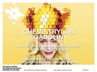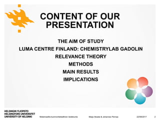 The document discusses a study on the relevance of the ChemistryLab Gadolin learning environment for various groups. The study used a qualitative case study method with surveys of 10 future teachers who worked as instructors at Gadolin. The main results were that Gadolin provided a relevant learning environment for future teachers, helping to develop their chemistry knowledge, teaching skills, and confidence in their career choice. Gadolin was also found to be relevant for visiting students, teachers and families by offering engaging chemistry activities, as well as for partner companies by allowing collaboration. The implications are that authentic experiential learning environments should have a larger role in teacher education.