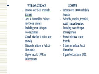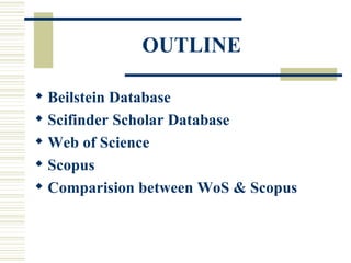 This document provides information about several scientific databases: Beilstein, SciFinder Scholar, Web of Science, and Scopus. Beilstein contains over 9 million substance records and reaction data from organic chemistry journals. SciFinder Scholar includes bibliographic databases like CAPLUS and MEDLINE as well as chemical reaction and substance databases. Web of Science provides access to citation indexes and allows forward and backward searching of references. Scopus contains over 15,000 peer-reviewed journal titles and references back to 1996.