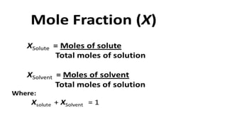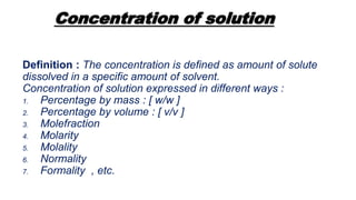 This document summarizes a seminar on concentration of solutions presented by Miss. Neha Milind Dhansekhar. It defines concentration and discusses various units used to express concentration, including percentage by mass and volume, molarity, molality, and ppm/ppb. It provides examples of calculating concentration using these units and converting between units. Common dilution calculations and sample problems determining the mass or moles of solute required for a given concentration are presented.