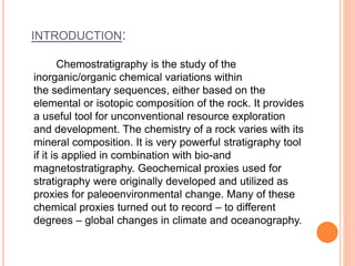 Chemostratigraphy is the study of chemical variations in rock sequences based on elemental or isotopic composition. It provides a useful tool for unconventional resource exploration. Some chemical signatures in rocks, like stable isotopes, can be used as accurate stratigraphic markers because they record global environmental changes over thousands of years. Common tools in chemostratigraphy include oxygen, carbon, and strontium isotope analysis, with strontium isotopes widely used for correlation due to long ocean residence times allowing identification of major shifts in the isotopic curve.
