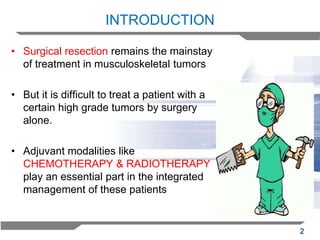 This document discusses the use of chemotherapy in orthopaedics, specifically for musculoskeletal tumors. It provides information on the different types and goals of chemotherapy, including neoadjuvant, adjuvant, and palliative chemotherapy. It discusses the mechanism of action, types of drugs used, and side effects. Treatment recommendations are provided for specific cancers like osteosarcoma, Ewing's sarcoma, multiple myeloma, and metastatic bone tumors. The overall goal of chemotherapy for these cancers is curative treatment, disease control, or palliation to improve quality of life.