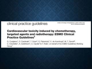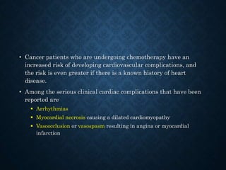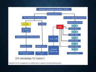 This document discusses chemotherapy-induced cardiotoxicity. It notes that cancer patients undergoing chemotherapy have an increased risk of cardiovascular complications, especially those with heart disease. Several chemotherapy agents can cause cardiotoxicity, including anthracyclines like doxorubicin, which can cause arrhythmias, myocardial necrosis, and cardiomyopathy. The risk increases with higher cumulative doses and factors like older age. Monitoring ejection fraction is important to detect toxicity early. While some damage may be permanent, early detection allows modifying treatment to prevent worsening heart failure.