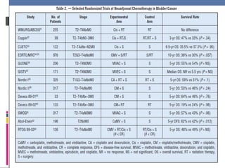 This document discusses chemotherapy options for metastatic bladder cancer. It notes that the prognosis remains poor with a median survival of 14 months. It reviews response rates of single agents like cisplatin, methotrexate, and doxorubicin. It then discusses combination regimens like MVAC (methotrexate, vinblastine, doxorubicin, and cisplatin), noting response rates of around 50% and median survival of approximately 12 months based on several studies. Larger phase 3 trials found MVAC improved median survival compared to cisplatin or cisplatin/cyclophosphamide regimens.
