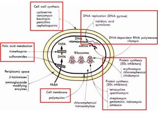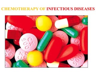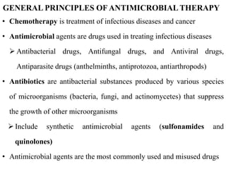 The document discusses general principles of antimicrobial therapy and chemotherapy of infectious diseases. It covers topics such as the ideal properties of antimicrobial drugs, mechanisms of bacterial resistance, principles of antimicrobial selection and combination therapy. It also discusses appropriate and misuse of antimicrobial agents, highlighting the importance of judicious antibiotic use to prevent resistance.
