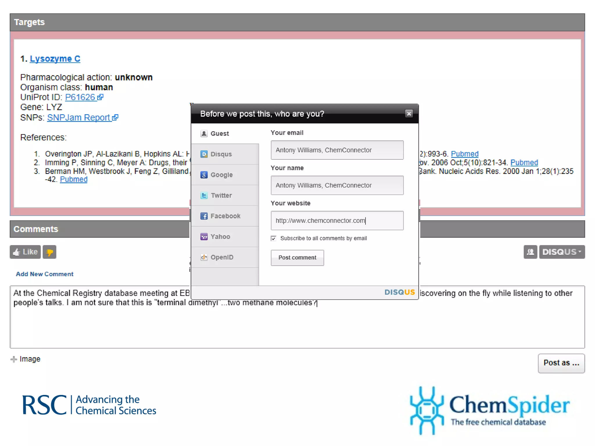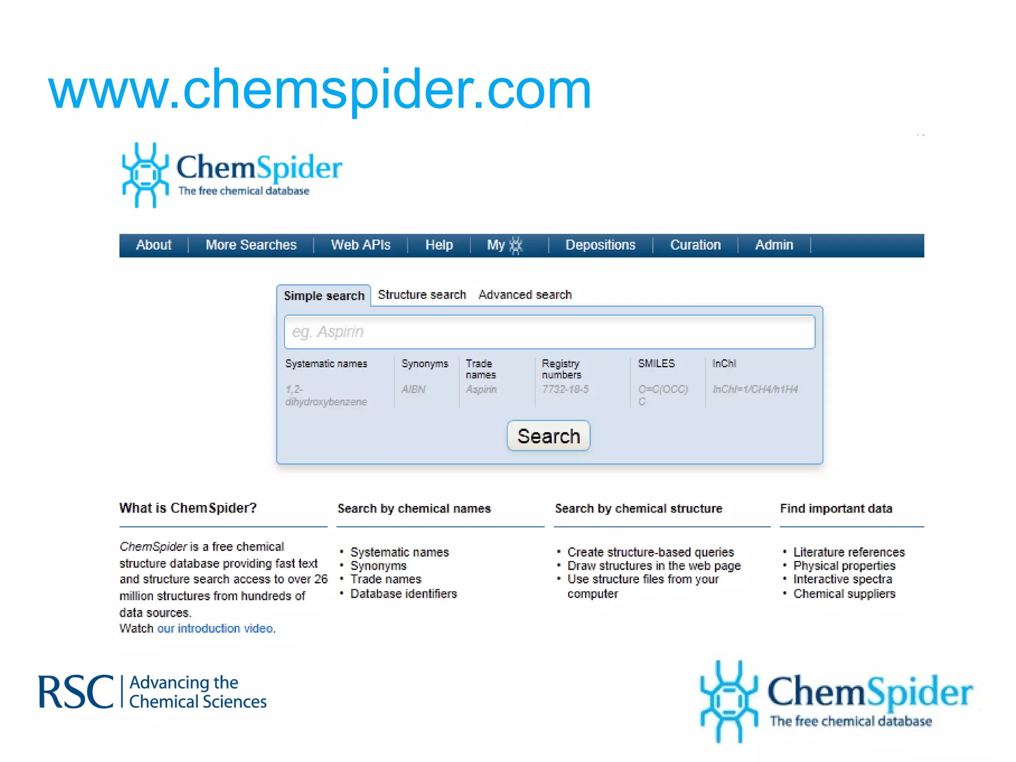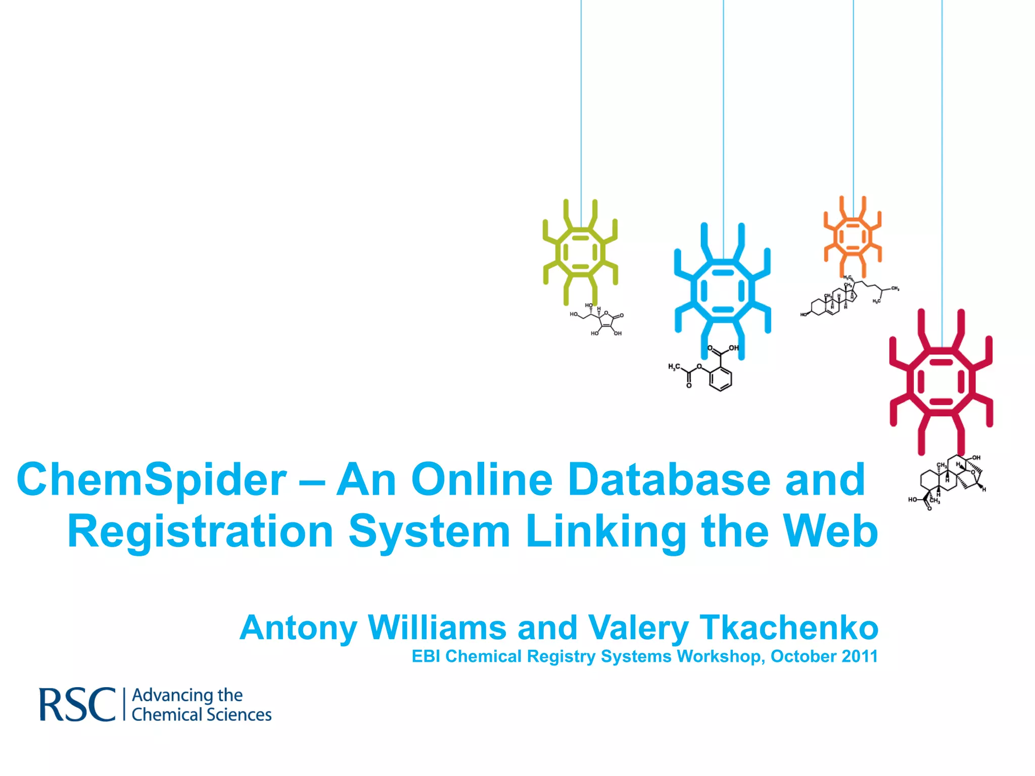 ChemSpider is an online database offering over 26 million unique molecules, utilizing open source components and crowd-sourced data curation. It addresses challenges in data quality and standardization, particularly with the InChI system, while focusing on accurate name-structure relationships for chemical entities. The project aims to standardize its entire database and enhance collaboration among data providers to improve the quality of chemical information available online.