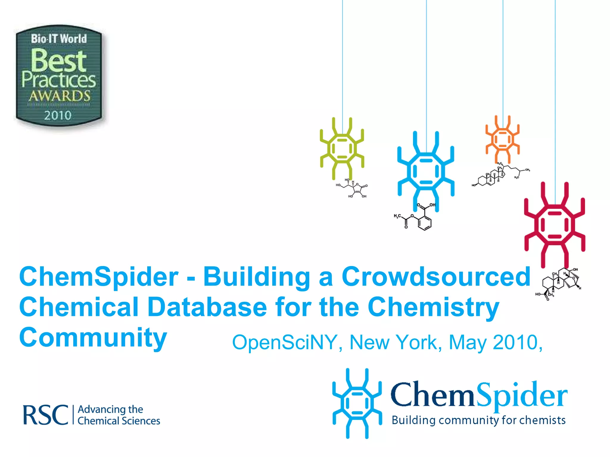 The document discusses the creation of ChemSpider, a crowdsourced chemical database aimed at the chemistry community, emphasizing the challenges of finding and validating chemical data online. It outlines the importance of structure-centric data aggregation and the role of community contributions in improving data accuracy. The future vision includes enhanced searching capabilities by chemical structure and a push for open access to chemical information.
