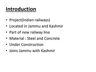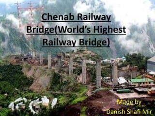 The Chenab Railway Bridge is a steel and concrete arch bridge that is under construction in Jammu and Kashmir, India. It will be part of a new railway line connecting Jammu to Kashmir. At 359 meters in height above the Chenab River, it will be the highest railway bridge in the world once completed. The bridge is 1,315 meters long with a main arch span of 485 meters and 17 total spans. It is being built to improve connectivity in the difficult terrain and provide safer travel between Jammu and Kashmir. Construction has faced challenges due to the region's harsh weather and poor geology but is expected to be finished by 2022.