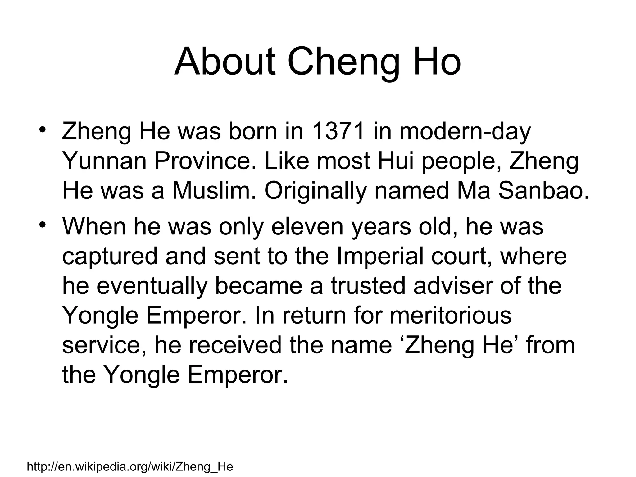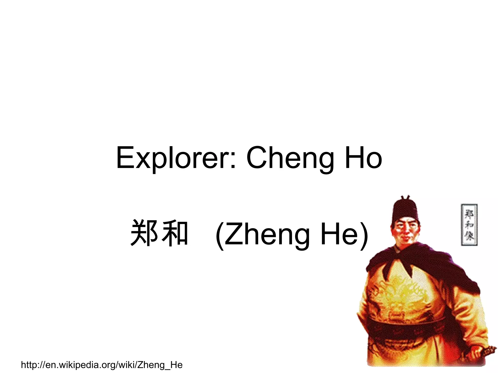 Zheng He was a Hui Chinese mariner, explorer, diplomat and fleet admiral who commanded voyages to Southeast Asia, South Asia, the Middle East and East Africa between 1405-1433 under the Ming Dynasty. He commanded fleets with hundreds of ships and over 27,000 crew members. As admiral, he led 7 voyages to establish Chinese tributary systems along the maritime route and spread Chinese influence. His fleet included 62 giant treasure ships that were some of the largest wooden ships in maritime history.