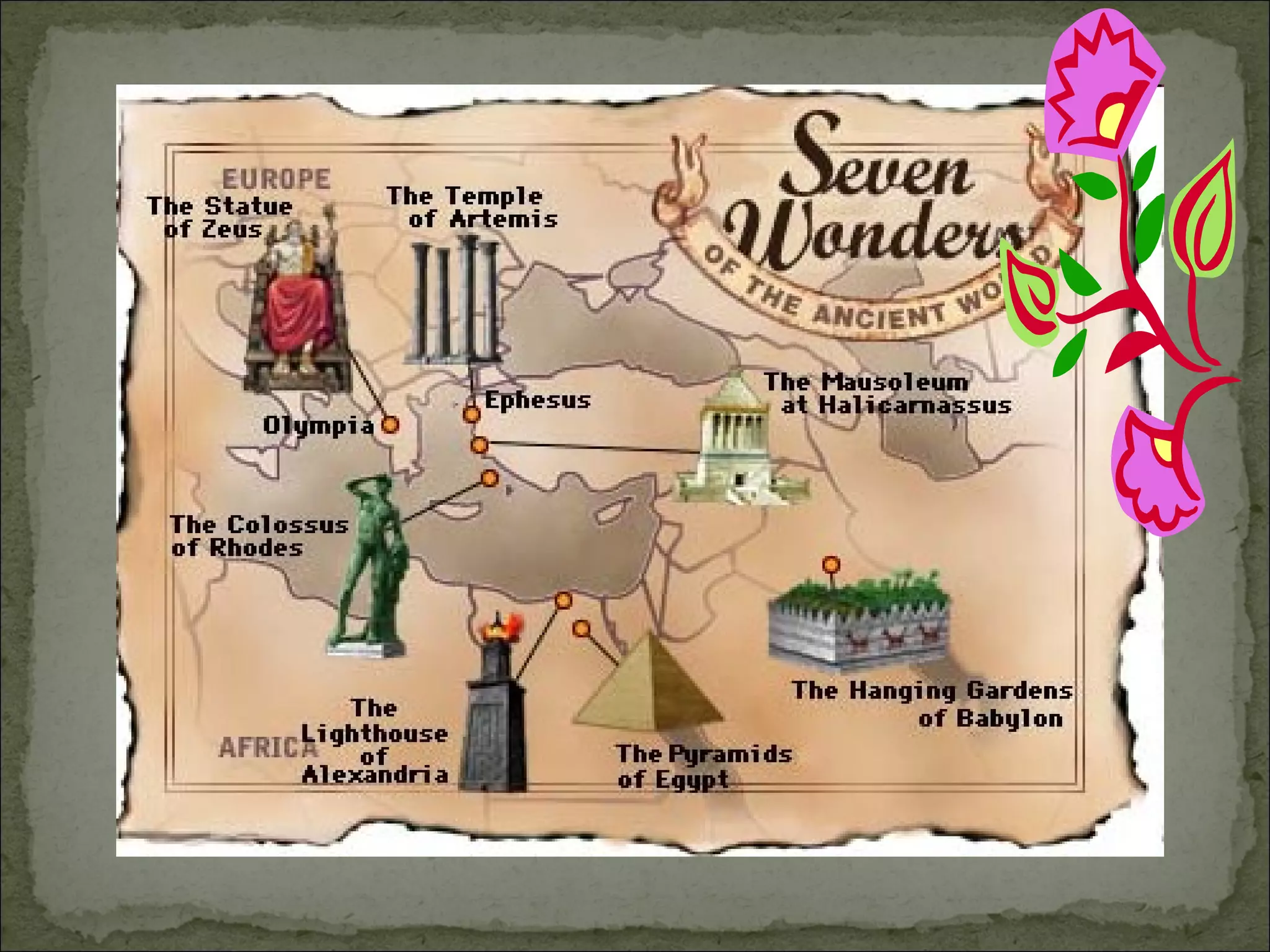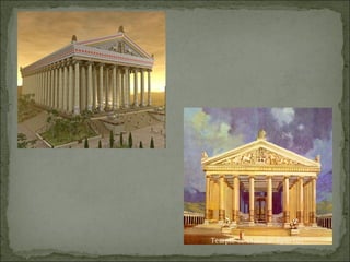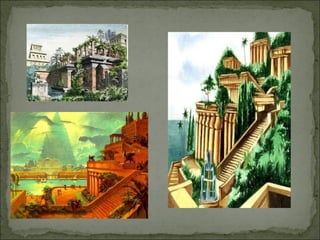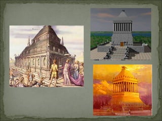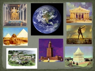 The document discusses the Seven Wonders of the Ancient World, a list of remarkable constructions from classical antiquity. It describes each of the seven wonders, including the Great Pyramid of Giza, Hanging Gardens of Babylon, Statue of Zeus at Olympia, Temple of Artemis at Ephesus, Mausoleum at Halicarnassus, Colossus of Rhodes, and Lighthouse of Alexandria. The wonders were built between 2500 BC and 280 BC by various ancient civilizations to celebrate religion, mythology, art, power, and science. Only the Great Pyramid of Giza still stands today.
