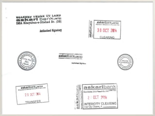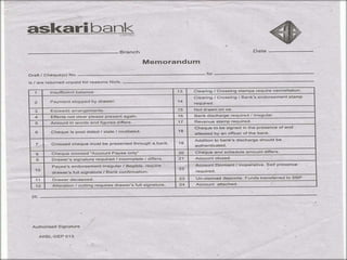 Askari Bank is a commercial bank in Pakistan that was founded in 1991 and acquired by Fauji Group in 2013. It has expanded to around 250 branches nationwide and an offshore banking unit in Bahrain. The document discusses clearing processes between banks, including inward and outward clearing of checks. It describes the role of the National Institutional Facilitation Technology (NIFT) in facilitating automated check clearing and settlement between banks through centralized processing. Key steps in inward and outward check clearing processes are outlined.