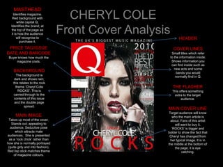 This double page spread features a large image of Cheryl Cole taking up the entire left page. The article is laid out around the image on the right page in small font. A drop capital "C" in red spans five lines of the article. A pull quote in bold red font reads "I don't know what I look like anymore, do you know what I mean?". The editorial language is formal and sets a serious tone for discussing Cheryl Cole's changed image to fit the magazine's rock theme carried throughout the issue.