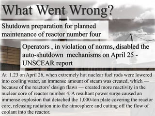 The Chernobyl nuclear disaster occurred on April 26, 1986 at the Chernobyl Nuclear Power Plant in Ukraine. During a planned maintenance shutdown, a power surge caused two explosions that destroyed the reactor and released radiation into the atmosphere. Over 300,000 people were evacuated and large areas of Ukraine, Belarus, and Russia became contaminated. While dozens died in the immediate aftermath, it is estimated that thousands more developed cancer years later due to radiation exposure. The disaster created a large exclusion zone and the reactor is now contained under a massive new sarcophagus, where it will remain radioactive for centuries.