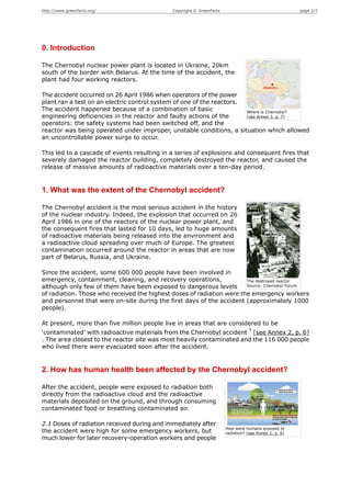 The Chernobyl nuclear accident in 1986 was the most severe accident in the history of the nuclear industry. It occurred at the Chernobyl Nuclear Power Plant located in Ukraine near the border with Belarus. Large amounts of radioactive materials were released into the environment, contaminating areas in Ukraine, Belarus, and Russia. Over 100,000 people were evacuated from the most contaminated areas closest to the reactor. The accident caused widespread health and environmental impacts that continue to affect the region. It also resulted in huge economic and social costs for the affected countries. While radiation exposures have decreased over time, concerns remain about health effects and long-term management of contaminated areas.
