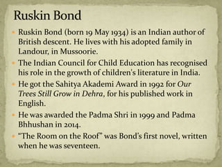 Ruskin Bond is an Indian author who lives in Mussoorie. The story is about a boy named Rakesh who lives with his grandfather on the outskirts of Mussoorie. One day after buying cherries from the market, Rakesh plants the seed of the last cherry. Over the next few years, with the care of Rakesh and his grandfather, the seed grows into a cherry tree. The tree faces difficulties from insects and being cut but continues to grow. Rakesh and his grandfather develop a strong attachment to the tree they planted themselves.