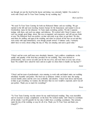 Cheryl and To Your Taste Catering provided exceptional catering services for multiple weddings and events, receiving rave reviews from many satisfied clients for their delicious food, attentive service, flexibility, and helping to ensure each event ran smoothly. Feedback highlighted Cheryl's organization, responsiveness to clients' needs and budgets, and ability to take the stress out of planning by being a single point of contact.