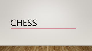 Chess is a two player board game that originated in India. The goal is to checkmate the opponent's king by placing it in a position where it cannot escape capture. Each player controls 16 pieces: 1 king, 1 queen, 2 rooks, 2 bishops, 2 knights, and 8 pawns. Each piece type moves in a distinct way. Modern chess evolved from earlier versions in India and Persia, becoming popular worldwide over centuries. Major historical figures helped advance the game and its competitive aspects.