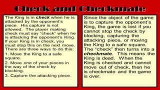 The document provides information on the history of chess, why playing chess is beneficial, basic chess rules, and how to set up the chess board. It discusses how chess can raise IQ, prevent Alzheimer's, exercise the brain, and improve memory and problem solving skills. It outlines the basic rules that each player has 16 pieces of 6 different types, white always moves first, and the positions of the king and queen pieces. It also describes each chess piece's movement - pawns move forward one square at a time, bishops diagonally, the queen combines bishop and rook movement, rooks horizontally and vertically, knights in an L-shape, and the king one square at a time in any direction.