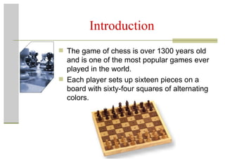 The document discusses key strategic concepts in the game of chess. It explains that strategy involves gaining small advantages through understanding piece strengths, influence on the board, and powerful tactics like forks, pins, and combination attacks. These strategic approaches aim to maneuver an opponent into checkmate, where their king cannot escape capture.