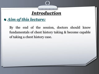 This document provides guidance on taking a chest history from patients. It discusses the importance of history taking in making an accurate diagnosis. The general approach to history taking is described, including introducing oneself, treating the patient with respect, listening, and asking clear questions. Specific aspects of the chest history are then covered in detail, including personal history, chief complaint, history of present illness, past history, and family history. Cardinal and minor chest symptoms are defined. Case examples are presented to demonstrate applying the history to form a provisional diagnosis and plan appropriate investigations.