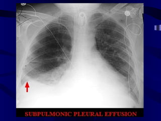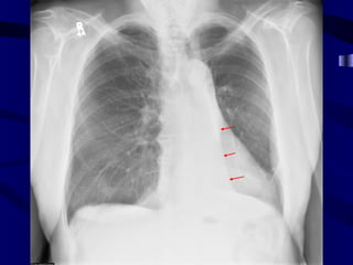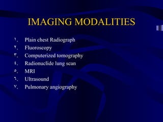 This document provides an overview of various imaging modalities used for chest imaging including plain chest radiographs, computed tomography, MRI, nuclear medicine scans, ultrasound, and pulmonary angiography. It describes the technical aspects and clinical applications of each modality. Key points covered include how plain chest radiographs remain diagnostic in 80% of cases and involve standard views, as well as how computed tomography is the main further investigation for most chest x-ray abnormalities and certain scenarios like pulmonary embolism.