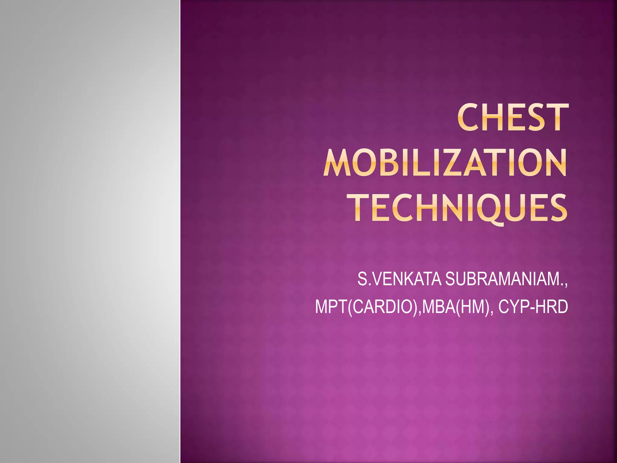 This document discusses goals and techniques for chest mobilization. The goals are to maintain or improve mobility of the chest wall, trunk, and shoulders when affected by tightness or other issues. This can improve ventilation. Techniques described include stretching tight muscles while taking deep breaths, and leaning forward during expiration to push internal organs up against the diaphragm. Specific chest mobilization techniques involve movements like bending, lateral flexion, rotation, arm movements, and pulling the knees to the chest while breathing. Contraindications include rib fractures, bone cancer, tuberculosis, osteoporosis, hernias, severe pain, and unstable vital signs.