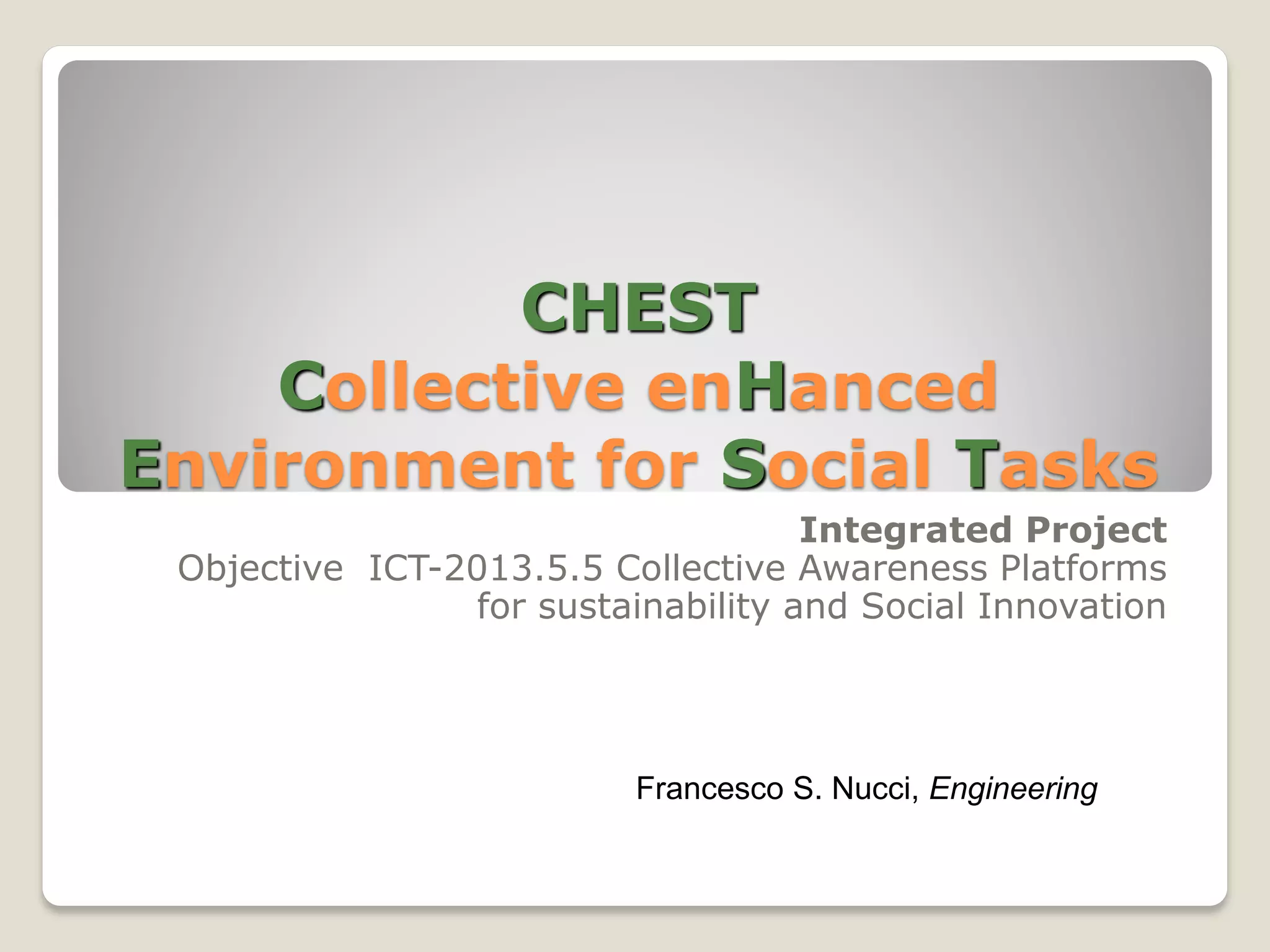 The document summarizes the CHEST project, which aims to foster social innovation through an open collective deliberation platform. The project will engage organizations in social innovation and entrepreneurship to create an information platform using social media. It will distribute funds through two open calls and experiment with innovative evaluation and co-funding schemes. The project has 21 supporting partners and is coordinated by Engineering with a budget of €2.95 million over 30 months.