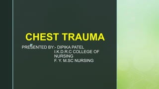 Chest trauma is one of the leading causes of death worldwide. It can be classified as either blunt trauma or penetrating trauma. Blunt chest trauma is more common and results from forces like compression or impacts. Common injuries include rib fractures, sternal fractures, pulmonary contusions, pneumothorax, hemothorax, and flail chest. Diagnostic tests include chest x-rays and CT scans. Treatment depends on the severity and type of injury but generally involves pain management, breathing treatments, and surgery to repair damage and drain fluids if needed.