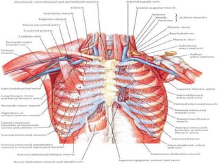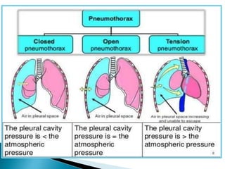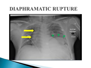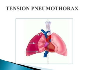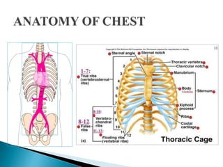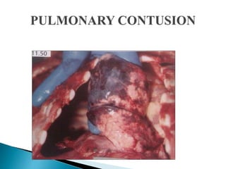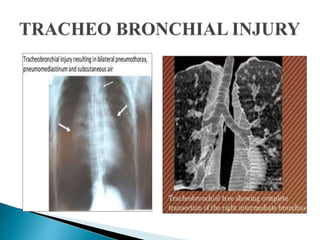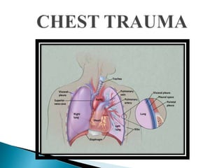 Chest injuries are common and can be life-threatening. The document discusses various types of chest injuries including blunt trauma, penetrating trauma, and compression injuries. It covers anatomy of the chest, definitions, causes, symptoms, management, and potential complications of specific injuries like pneumothorax, hemothorax, flail chest, and cardiac tamponade. Immediate life-threatening injuries require stabilization of the airway, breathing, and circulation before further treatment.