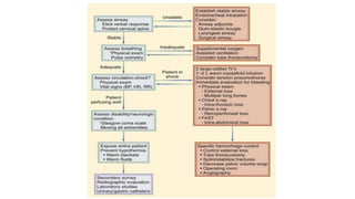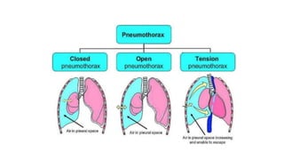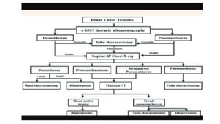 Chest trauma can represent a major burden and lead to significant morbidity and mortality. Chest injuries require prompt evaluation and management to address life-threatening injuries like tension pneumothorax, hemothorax, and cardiac injuries. The chest is divided into the thoracic cavity containing the lungs, heart, and great vessels which are vulnerable to injury from blunt or penetrating trauma. Common injuries include rib fractures, flail chest, pulmonary contusions, and pneumothorax. Immediate airway control and treatment of life-threatening injuries is essential, followed by management of potential injuries and complications to optimize outcomes.