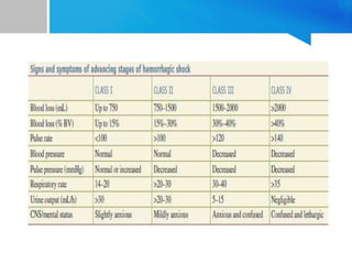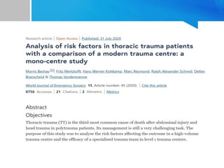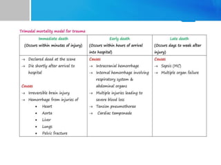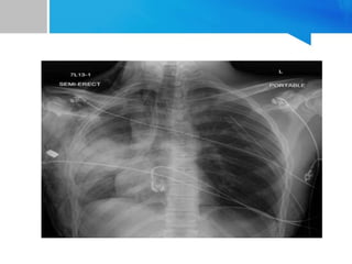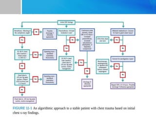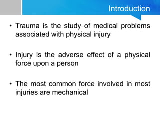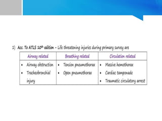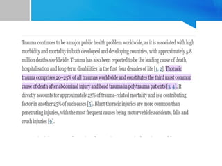 This document provides an overview of chest trauma. It begins by defining trauma and injuries, noting that mechanical forces are most common. Chest injuries account for 20-25% of trauma deaths. Blunt and penetrating injuries are classified. Motor vehicle collisions are a leading cause of chest trauma. The ATLS principles focus on rapid assessment and management to reduce morbidity and mortality. The primary survey addresses airway, breathing, circulation, disability and exposure. Specific injuries like pneumothorax, hemothorax, flail chest and cardiac tamponade are discussed in terms of pathophysiology, diagnosis and management. Tube thoracostomy and thoracotomy are mentioned as approaches to drainage for certain injuries.