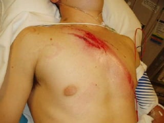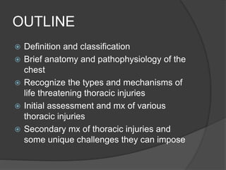 This document outlines the anatomy of the chest and describes various types of chest trauma, including blunt and penetrating injuries. It discusses the initial assessment and management of life-threatening injuries like tension pneumothorax, massive hemothorax, and cardiac tamponade. The document also covers procedures like needle decompression, tube thoracostomy, and emergency department thoracotomy that may be used to treat severe chest trauma. Overall, the document emphasizes the importance of promptly identifying and treating life-threatening injuries to the chest.