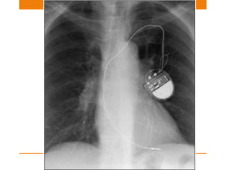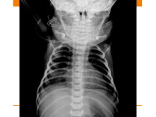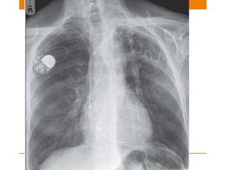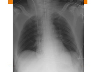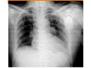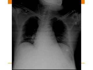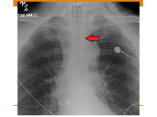 Central lines and tubes seen on chest x-rays include central venous catheters, pulmonary artery catheters, nasogastric tubes, endotracheal tubes, and tracheostomy tubes. Correct positioning is important to avoid complications. A central venous catheter's tip should be in the superior vena cava or brachiocephalic vein. A pulmonary artery catheter is used to assess pressures but is now less common. A nasogastric tube's tip should be past the stomach. An endotracheal tube should be 5-7cm above the carina. Tracheostomy tubes lie parallel to the trachea above the carina.