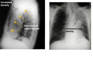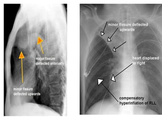 1. Loss of volume - The affected lobe or lung appears smaller in size compared to the contralateral side.