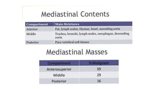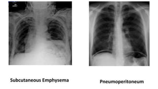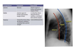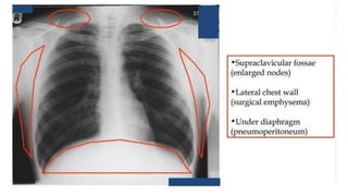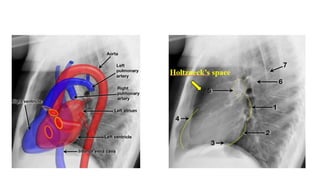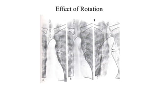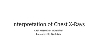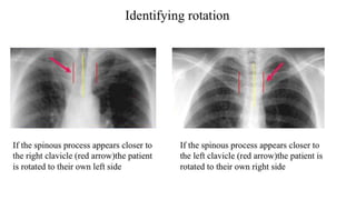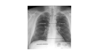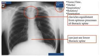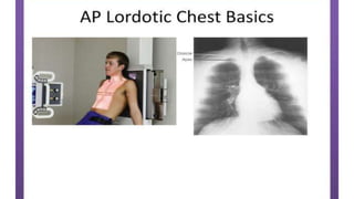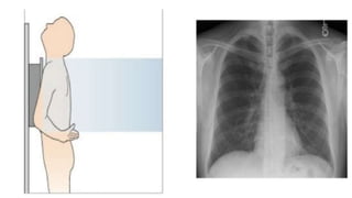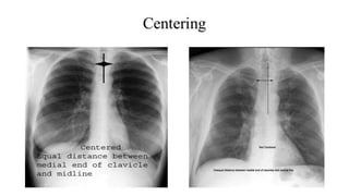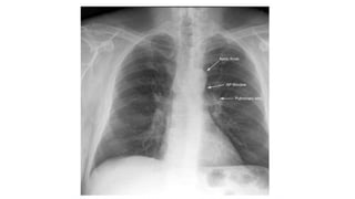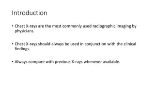 Chest x-rays are commonly used to image the chest. They should be interpreted in the context of clinical findings and compared to prior x-rays. Tissues have different densities: gas is least dense while bone is most dense. Inspiration, penetration, and rotation impact image quality. Standard views include PA, AP, lateral, and decubitus. When interpreting, examine the airway, bones, cardiomegaly, vascular patterns, diaphragm, effusions, and lung fields for abnormalities. Prior films aid in detecting subtle changes over time.