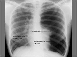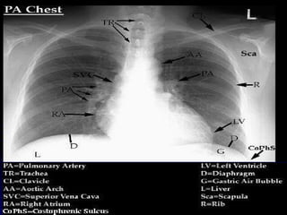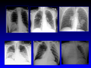 This document provides a 12-step process for analyzing chest x-rays and summarizes common findings seen on chest x-rays. It describes what to examine on a chest x-ray such as heart size and lung fields. It then reviews normal chest x-ray anatomy and presents examples of common abnormalities like pneumonia, tumors, fractures, and fluid buildup.
