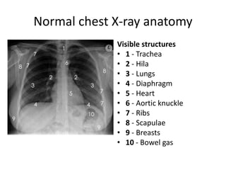 This document provides an overview of normal chest X-ray anatomy, including the 10 main visible structures and their typical appearance. It describes the trachea, hila, lungs, diaphragm, heart, bones, and other key points of assessment. The document emphasizes that a systematic approach is needed to evaluate each anatomical structure on every chest X-ray for abnormalities. Certain structures only become visible if abnormal and thorough assessment of the whole chest X-ray is important for accurate diagnosis.