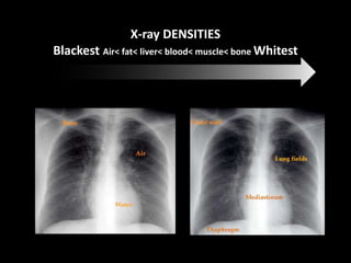 This document provides an overview of chest X-rays, including X-ray densities, common abnormal findings, technical aspects, different views used, and anatomy seen on chest X-rays. It then summarizes different pathologies visible on chest X-rays such as pleural effusions, pulmonary edema, cavities, masses, pneumothorax, and others. Key anatomical structures that can be seen as silhouettes on chest X-rays are also outlined.