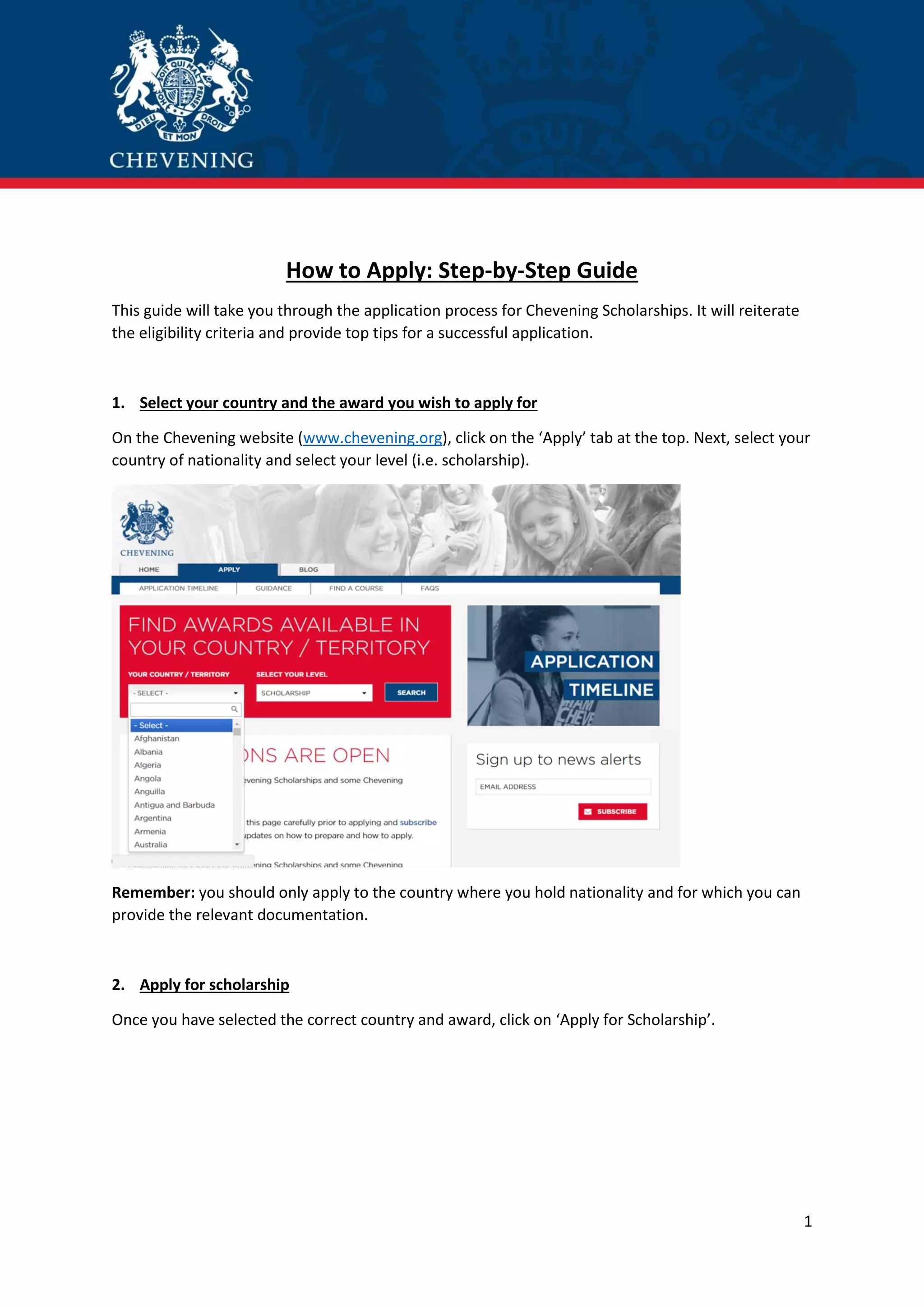 The document provides a 23-step guide to applying for Chevening Scholarships. It outlines the application process including selecting a country and award, registering personal details, confirming eligibility, completing sections on education, work experience, English language ability, selecting university courses, and answering short essay questions. Applicants must submit two references by the specified deadline if invited to interview. The guide emphasizes meeting all eligibility criteria and application requirements and deadlines to have a successful application.