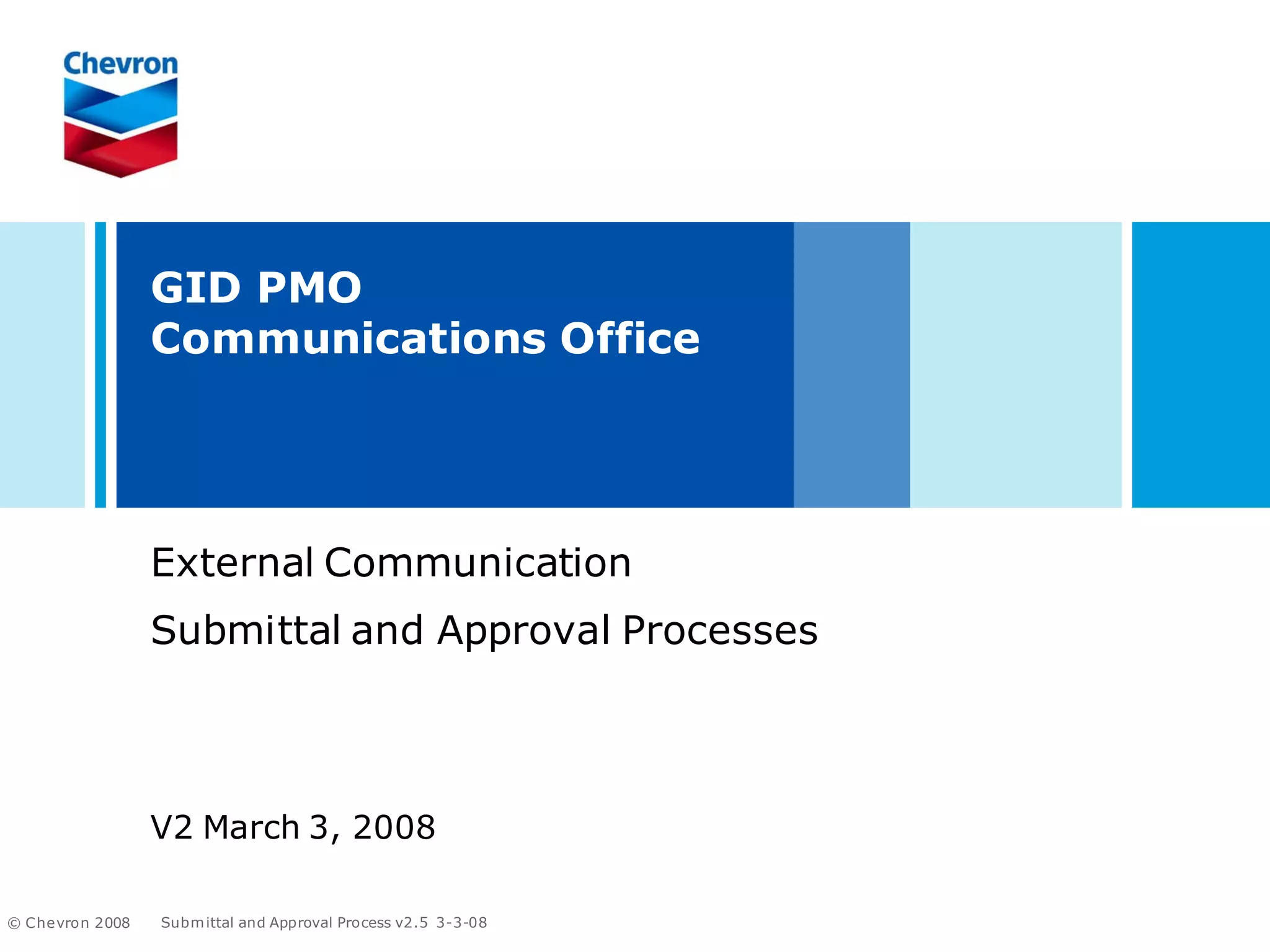 The document outlines Chevron's external communication approval process. It describes reviewing communications to improve customer and partner perception. All external communications must be reviewed by the General Manager and Communications Controller. The process involves identifying the audience, drafting the message, submitting it for review, and distributing the approved message. It provides guidance on determining what types of communications require review.