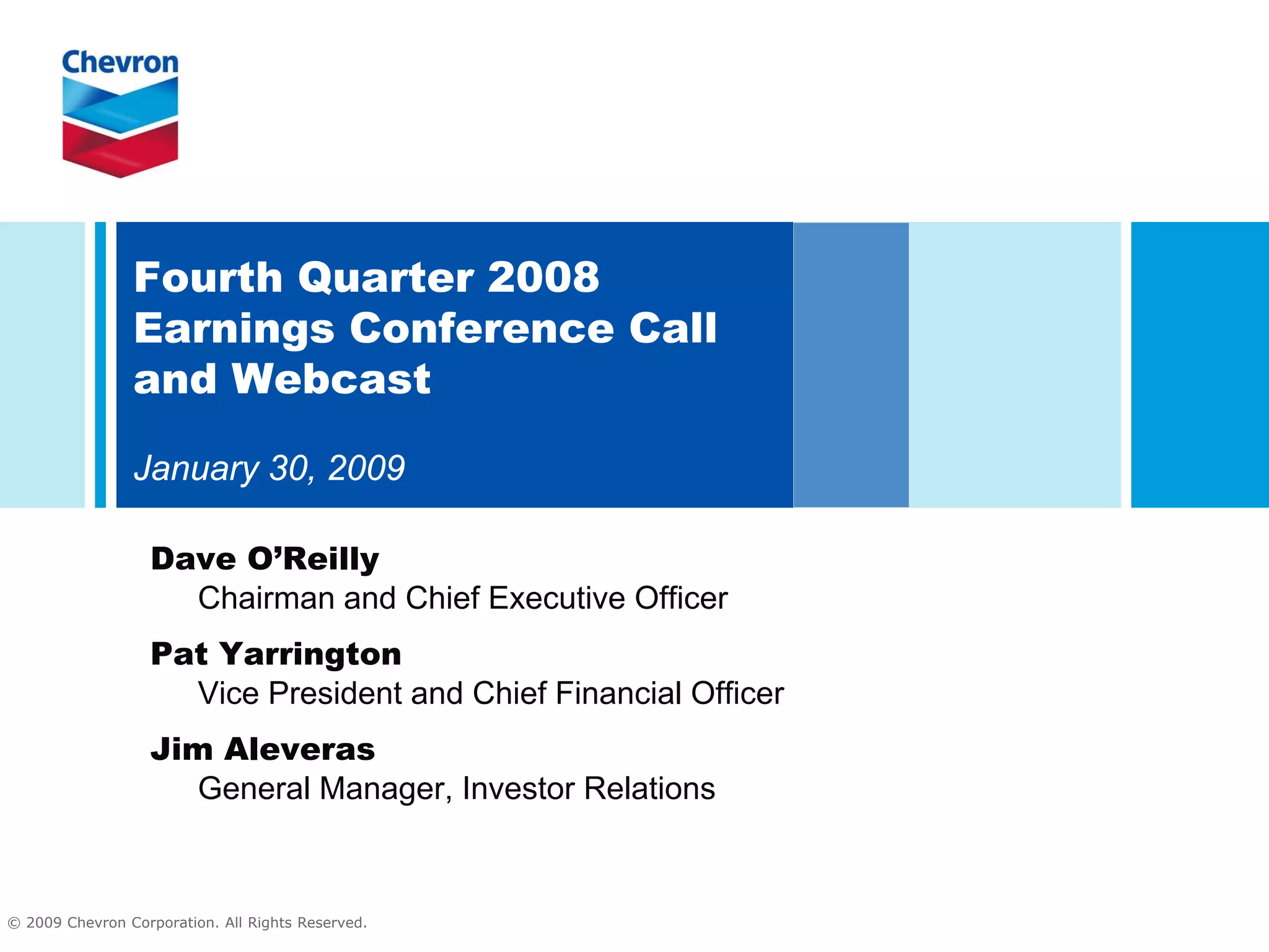 This document summarizes Chevron's fourth quarter 2008 earnings conference call. It discusses Chevron's Q4 2008 earnings of $4.9 billion and earnings per share of $2.44. It also provides details on Chevron's 2008 return on capital employed, debt ratio, and share repurchases. The document reviews Chevron's Q4 2008 earnings performance across its upstream, downstream, and other segments and discusses its 2009 capital and exploratory budget and production outlook.