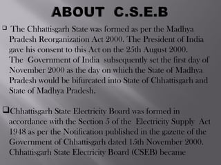 The Chhattisgarh State was formed in November 2000 according to the Madhya Pradesh Reorganization Act 2000. The Chhattisgarh State Electricity Board was then formed and started functioning on December 1, 2000. In 2008, the Chhattisgarh State Electricity Board was reorganized into 5 companies according to the Electricity Act 2003: the Chhattisgarh State Power Holding Company Limited, the Chhattisgarh State Power Generation Company Limited, the Chhattisgarh State Power Transmission Company Limited, the Chhattisgarh State Power Distribution Company Limited, and the Chhattisgarh State Power Trading Company Limited.