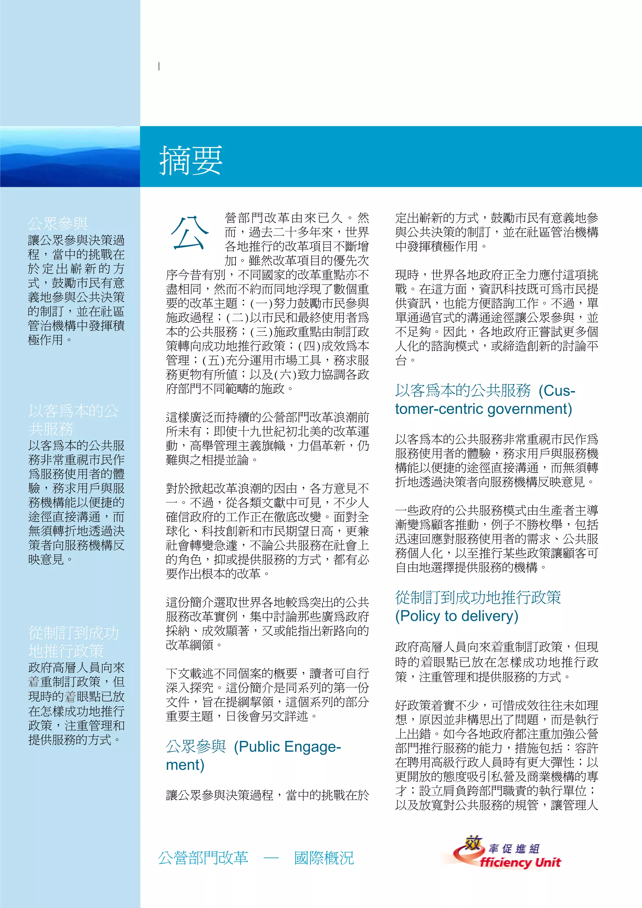 文档探讨了全球公共部门改革的趋势,强调鼓励公民参与公共决策的重要性。不同国家在改革重点上的差异,同时也突显了如创新咨询模式和跨部门合作等管理策略。在项目实施过程中,政府应注重成果导向,以提高公共服务的质量和效率。