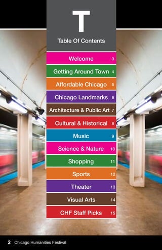 The document provides an overview of attractions, activities, and places of interest in Chicago, highlighting the city's cultural institutions, historical sites, museums, theaters, art galleries, restaurants, parks, and methods of transportation. It includes brief descriptions and key details about notable landmarks, neighborhoods, and cultural offerings like architecture, the arts, sports, shopping, and more. The guide aims to help visitors take advantage of all the activities and attractions Chicago has to offer.