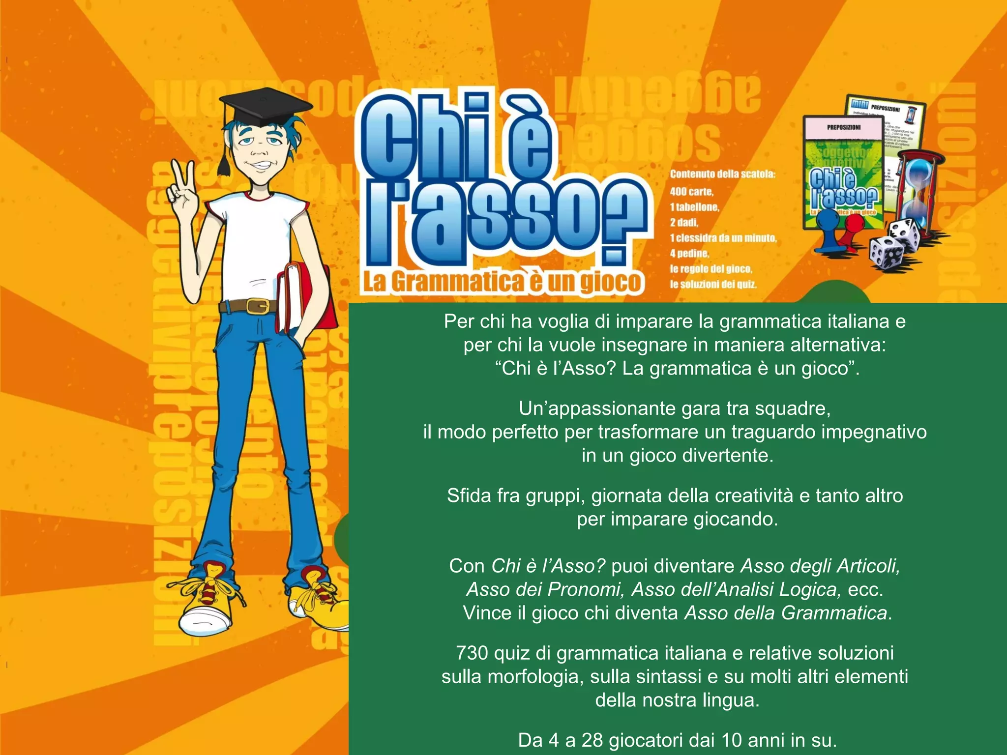 Il documento presenta il gioco da tavola "Chi è l'asso?", un metodo innovativo per insegnare la grammatica italiana attraverso competizioni a squadre. Consiste in 730 quiz su vari argomenti grammaticali e si propone di motivare gli studenti a imparare divertendosi, affrontando concetti come morfologia e sintassi in un ambiente cooperativo. Inoltre, il gioco è supportato da istituzioni accademiche e include eventi come le Olimpiadi nazionali per promuovere ulteriormente l'apprendimento della lingua.