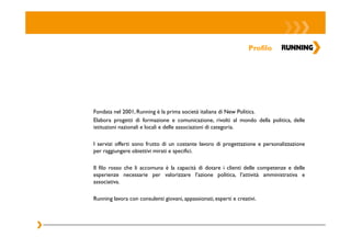 Running, fondata nel 2001, è la prima società italiana di new politics, specializzata in formazione e comunicazione per la politica e le istituzioni. Fa parte del gruppo Reti, mirando a connettere il mondo istituzionale con le esigenze delle imprese e dei cittadini. Il team comprende esperti in comunicazione, eventi e marketing politico, impegnati a migliorare la rappresentanza degli interessi in Italia e in Europa.