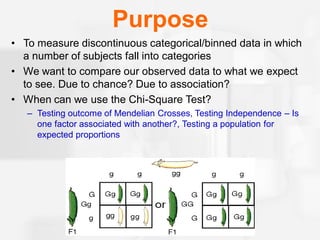 The document discusses the Chi-Square statistic, which is used to compare observed categorical data to expected values to determine if any differences are statistically significant. It outlines the assumptions, requirements, and steps to conduct a Chi-Square analysis, including defining the null hypothesis, calculating expected and observed frequencies, determining the Chi-Square value and degrees of freedom, and comparing the Chi-Square value to a table to either reject or fail to reject the null hypothesis. The document emphasizes that a Chi-Square analysis determines the probability that any differences between observed and expected are due to chance rather than a real association between variables.