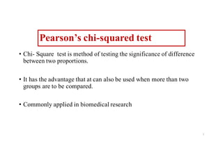 The document explains the Pearson’s chi-squared test, a statistical method used to determine the significance of differences between proportions, especially in biomedical research. It outlines the steps involved in performing the test, the calculation of expected values, the chi-squared value, and how to interpret the results, using smoking and hypertension as an example. The conclusion emphasizes the association between smoking and higher rates of hypertension, with a significant difference indicated by the chi-squared value.