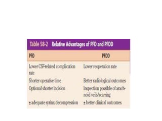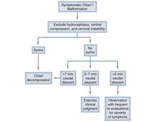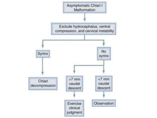 Chiari malformations are a group of hindbrain abnormalities classified into four types, ranging from Chiari I with tonsillar herniation to Chiari IV characterized by cerebellar hypoplasia. The document discusses associated anomalies, clinical features, and management approaches for each type, emphasizing diagnostic imaging and surgical interventions for symptomatic patients. Key considerations for surgical procedures include tonsillar descent, the presence of syrinx, and potential postoperative complications.